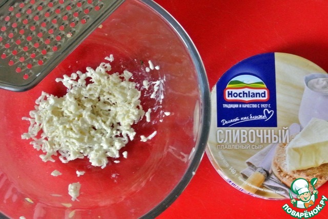 3 треугольника плавленого сыра предварительно положить в морозильник. Натереть на терке.