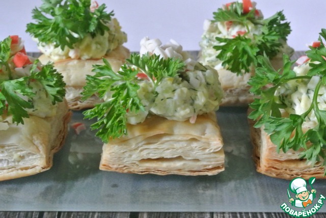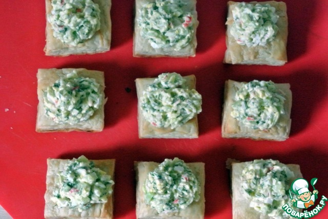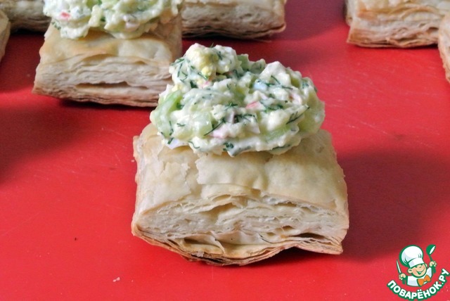 Люблю салаты, люблю слойки. В этом рецепте все соединилось в единое вкусное целое. Слойки можно испечь заранее, уложить в контейнер. Продукты для салата тоже выложить в контейнер, майонезом заправить на пикнике и выложить на испеченные изделия. Очень просто, легко.