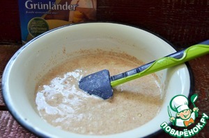 Смешать тёплые воду, молоко, сахар, 1 ст. л. мучной смеси и дрожжи.