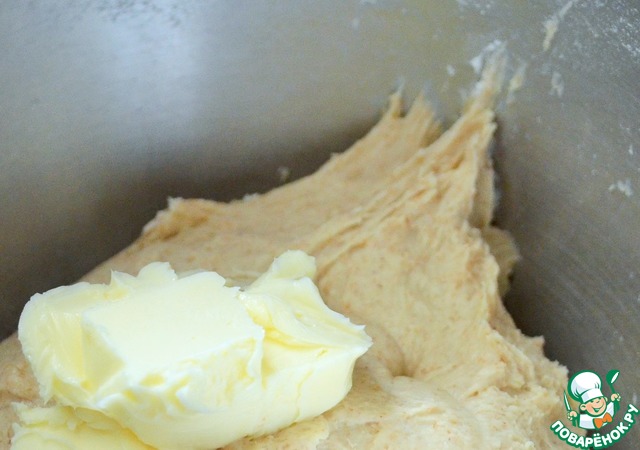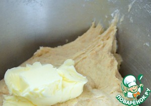 Смешать оба вида муки, яйцо, подошедшую опару, соль. Добавляя по немного мягкое масло, вымесить тесто до гладкости.