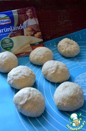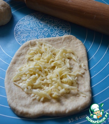 Каждый колобок раскатать в прямоугольник, 0,7-1 см. толщиной. На него разложить 15 г. сыра.