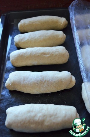 Тесто обмять, разделить на кусочки по 75 г., подкатать в колобки. Накрыть, оставить на 10 минут. -