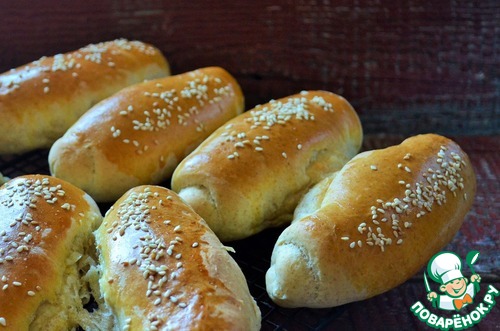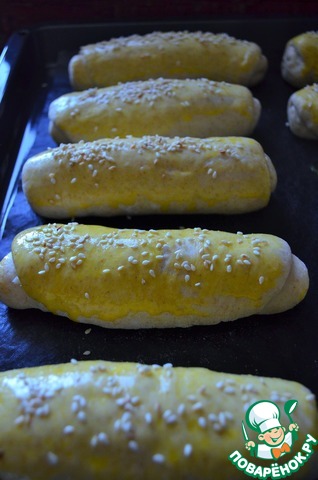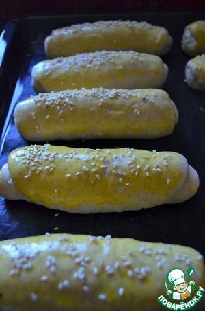 Расстоявшиеся заготовки смазать смесью желтка и сливок, посыпать кунжутом. Поместить в духовку.