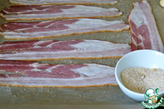 Выложить ломтики бекона на противень, посыпать сахаром и отправить в разогретую духовку на 5 минут. Из бекона должен вытопиться лишний жир.