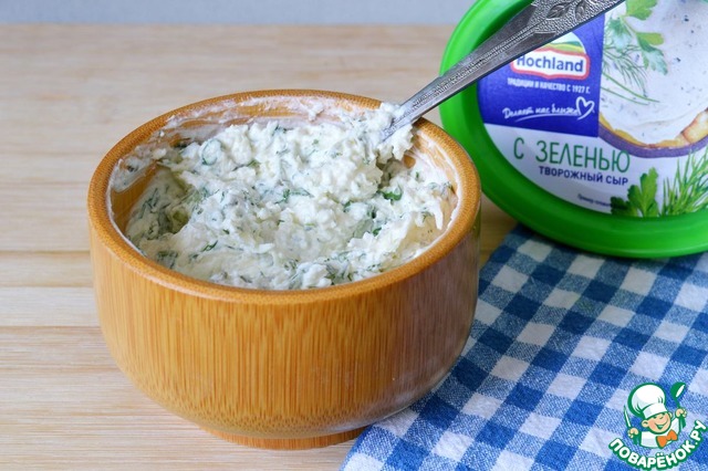 Творожный сыр соединить с измельченной зеленью. Хорошо перемешать.