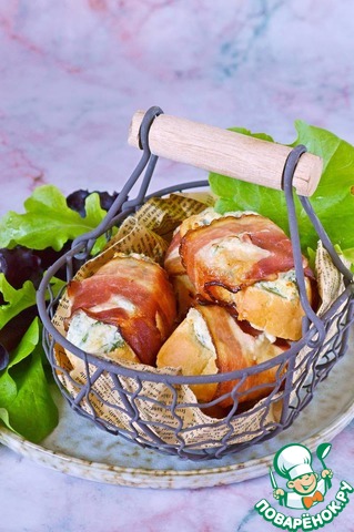 • Намазать тосты сырной массой, каждый обернуть ломтиком бекона. Выложить тосты на противень и отправить в духовку еще на 5-7 минут. Бекон должен стать золотистым.