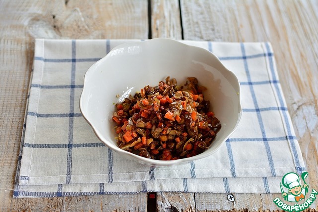 Сковороду смазать маслом, выложить резанные мелко шампиньоны.