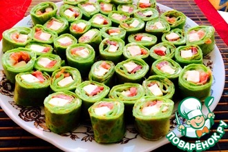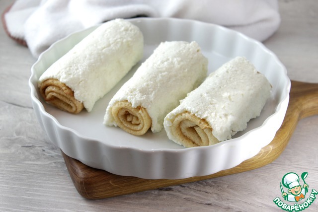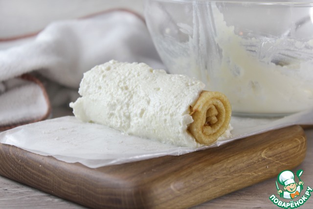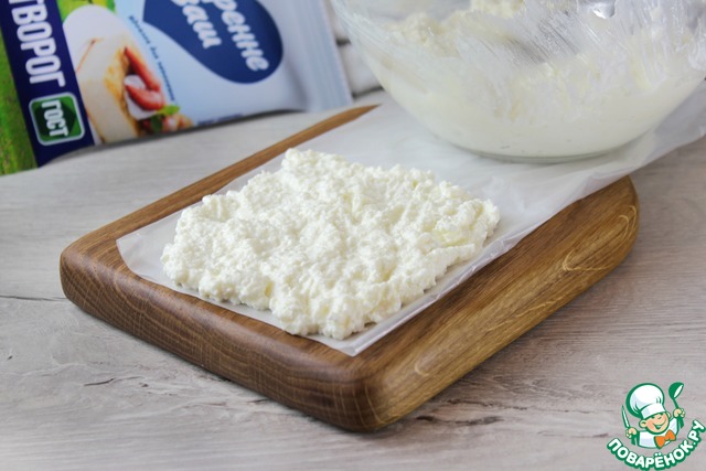 Порцию творожной массы выложить на небольшой кусочек целлофана, формируя прямоугольник, одна сторона которого будет равна длине блинного рулета.