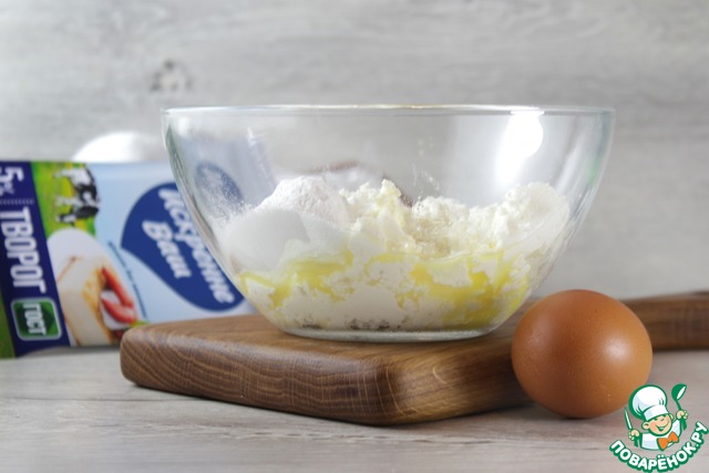 В чашку выложить творог, добавить желток и сахарную пудру, перемешать до однородности. Творожная масса готова.