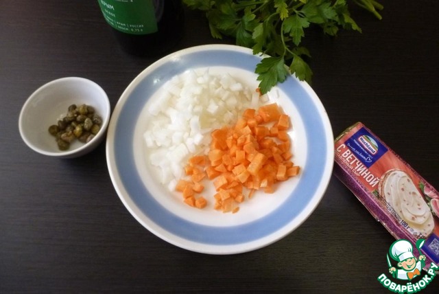 Подготовить ингредиенты для соуса. Мелким кубиком нарезать лук и морковь. Плавленый сыр у меня с ветчиной ТМ Хохланд. Он хорошо плавится, соус из него получается бархатистый и насыщенный.
