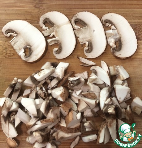 Часть крупных пластинок грибов оставим для украшения. Остальные грибы мелко порежем.