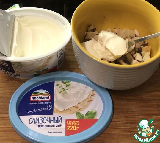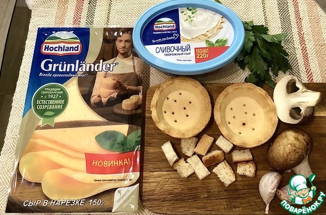 Сегодня на пикник приготовим тарталетки с грибами, сухариками и с двумя видами сыра, у меня полутвердый сыр Грюнландер и творожный сливочный от Хохланд!