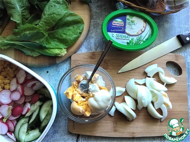 Делаем заправку непосредственно перед подачей салата. Отделяем белки от желтков у яиц. Белки отправляем к овощам. Желтки перетираем с творожным сыром и майонезом.