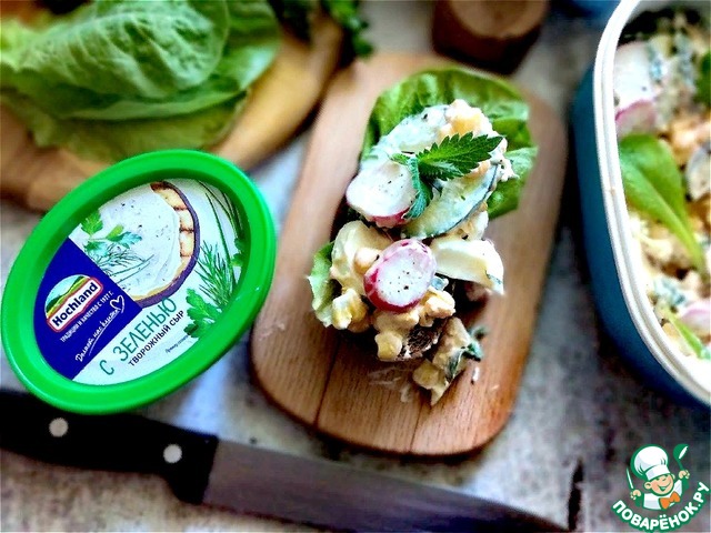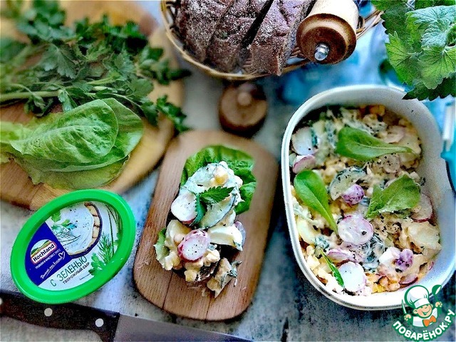 Салат можно есть как салат, а можно как закуску, выложив на кусок хлеба. На хлеб кладём крупный листик салата зелёного, а поверх - сам салат, украшаем листиками мелиссы или мяты. Очень душевно и нежно на вкус. В такой салат я никогда не кладу лук, даже зелёный. Я не люблю вкус редиса с луком.