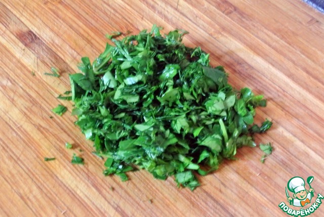 К яйцам добавить нарезанную зелень, соль, черный перец.