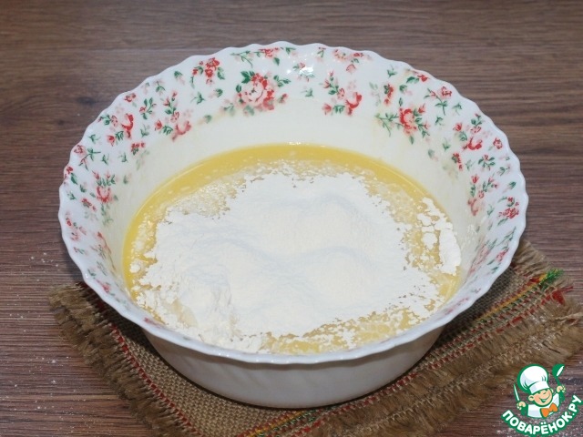 6. Просеять в жидкую смесь оставшуюся муку, замесить тесто без комочков. Можно воспользоваться миксером.