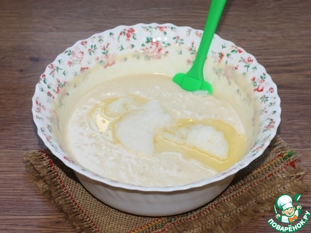2. В молочную смесь, просеять 1/2 часть муки, перемешать и взбить венчиком. Минут 20-30, дать дрожжам активироваться.