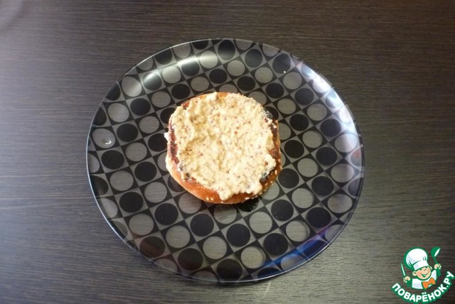 Булочки для гамбургеров разрезать пополам и обжарить до румяности.