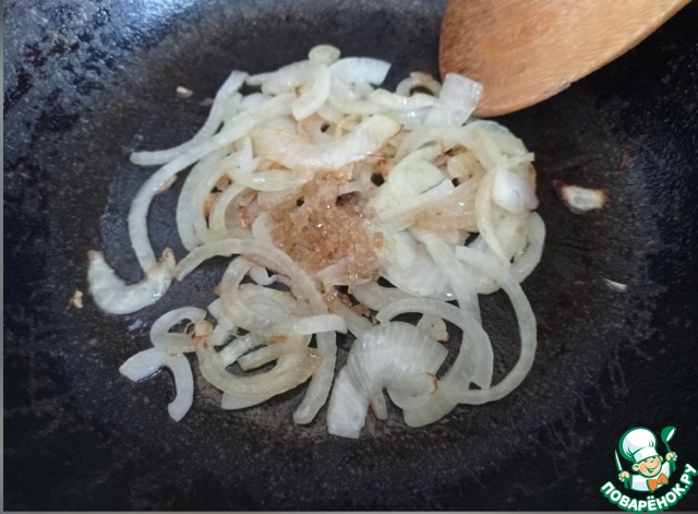 На сковороду наливаем половину количества масла. Обжариваем лук до лёгкой золотистости. Добавляем коричневый сахар, карамелизируем лук на среднем огне 5 минут. Убираем лук на тарелку.