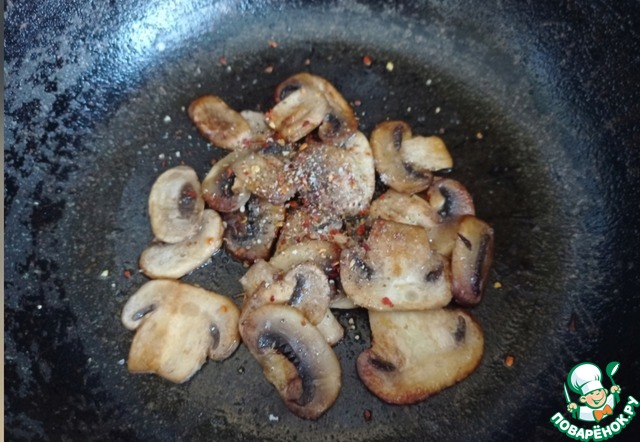 На сковороду добавляем остатки масла. Обжариваем шампиньоны до румяности на среднем огне. Кладём соль, смесь перцев, перец чили, тимьян, наливаем уксус, перемешиваем.