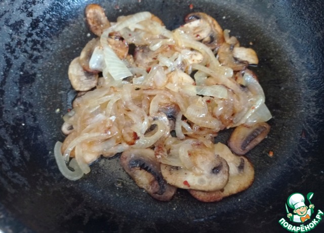 Кладём карамелизированный лук, перемешаем. Снимаем со сковороды.