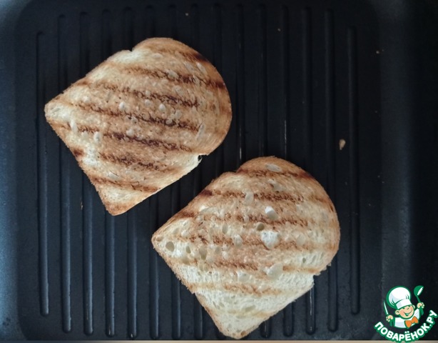Перед подачей, режем хлеб. Лучше использовать тостовый. Подсушиваем хлеб на решётке или сковороде-гриль.