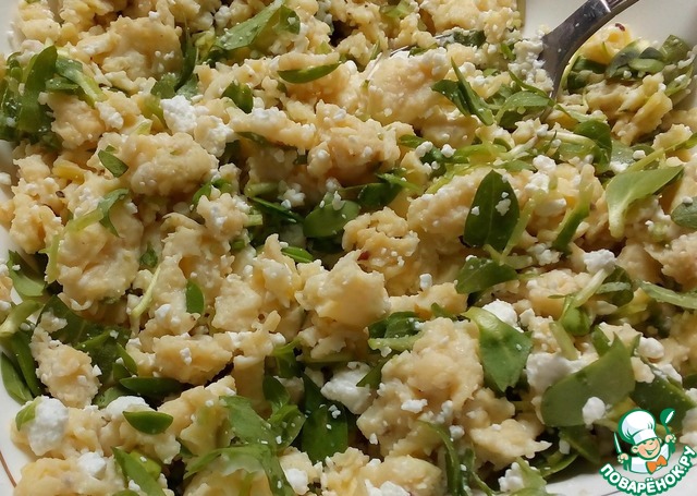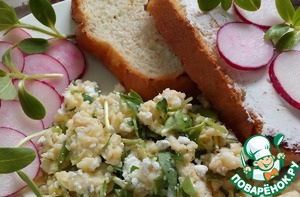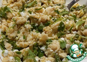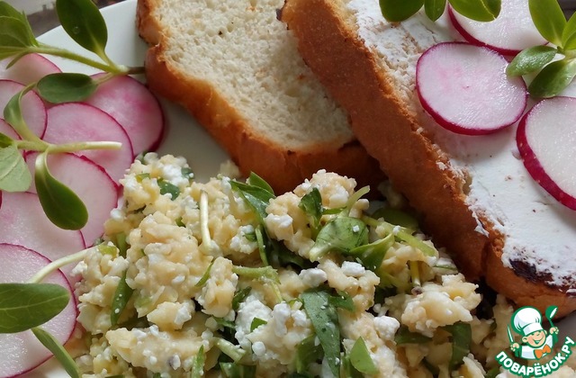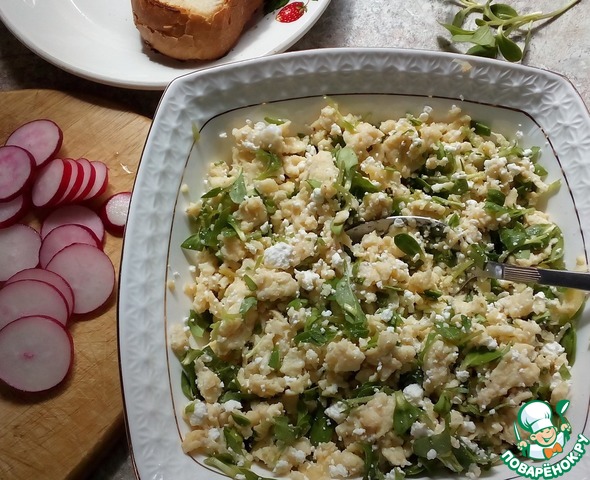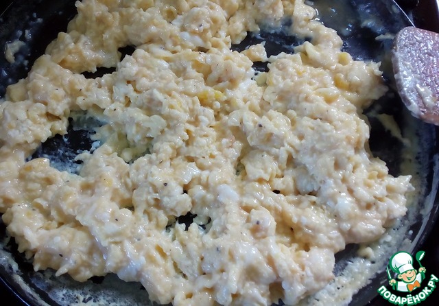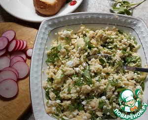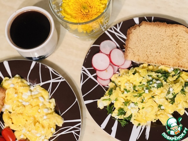 Выложить творог в блюдо к яичнице-болтунье. Хорошо для данного блюда подойдёт диетический творог ТМ "Искренне Ваш" 0% жирности.