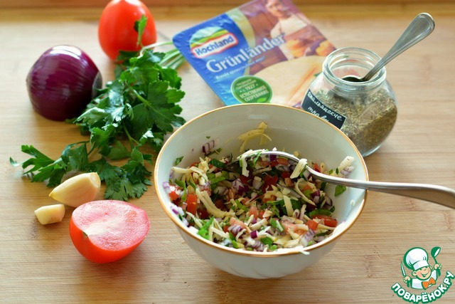 Для начинки смешайте натёртый сыр, мелконарезанный красный лук, помидор и петрушку. Приправьте слегка солью и итальянскими травами