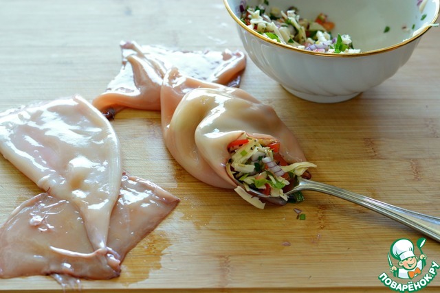 Кальмаров очистите от внутренностей и плёнок, удалите хитиновый скелет. Наполните начинкой не очень плотно. Данного количества начинки хватит на 2-3 кальмара