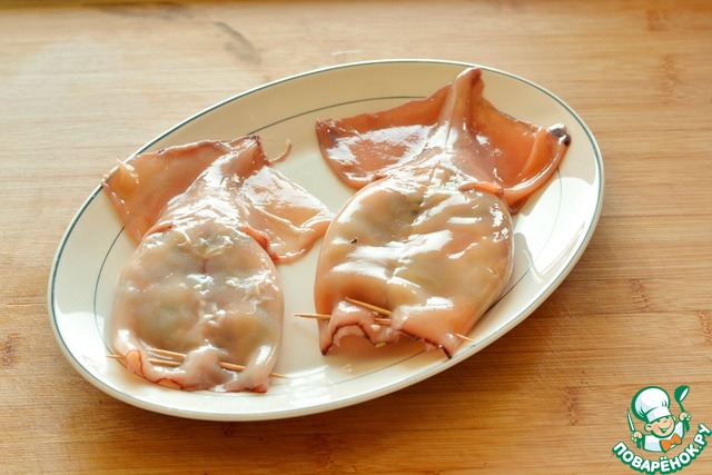 Сколите отверстие зубочистками. Слегка нажмите ладонью на кальмара, чтобы выпустить воздух и придать плоскую форму. Чуть подсолите кальмаров и смажьте растительным маслом.