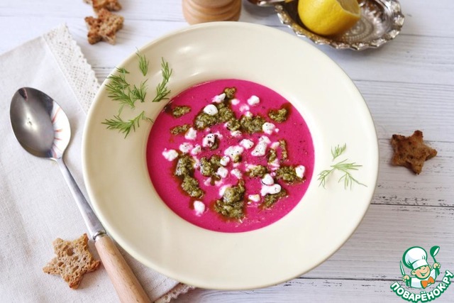 Рецепт «Свекольный суп-пюре с творогом и песто»: