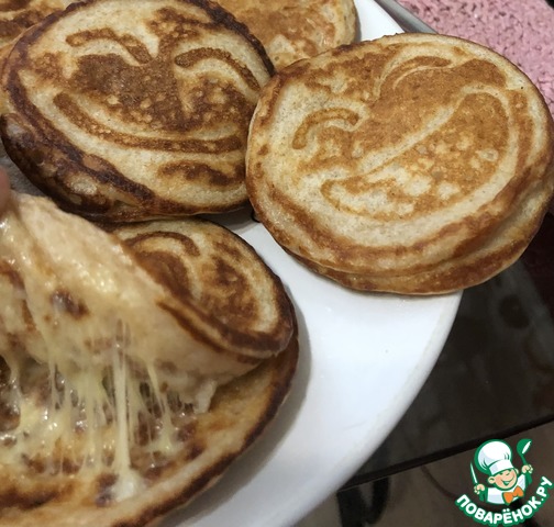 На горячий оладушек выкладываем сыр и закрываем вторым горячим оладушком. Сыр плавится и красиво тянется!