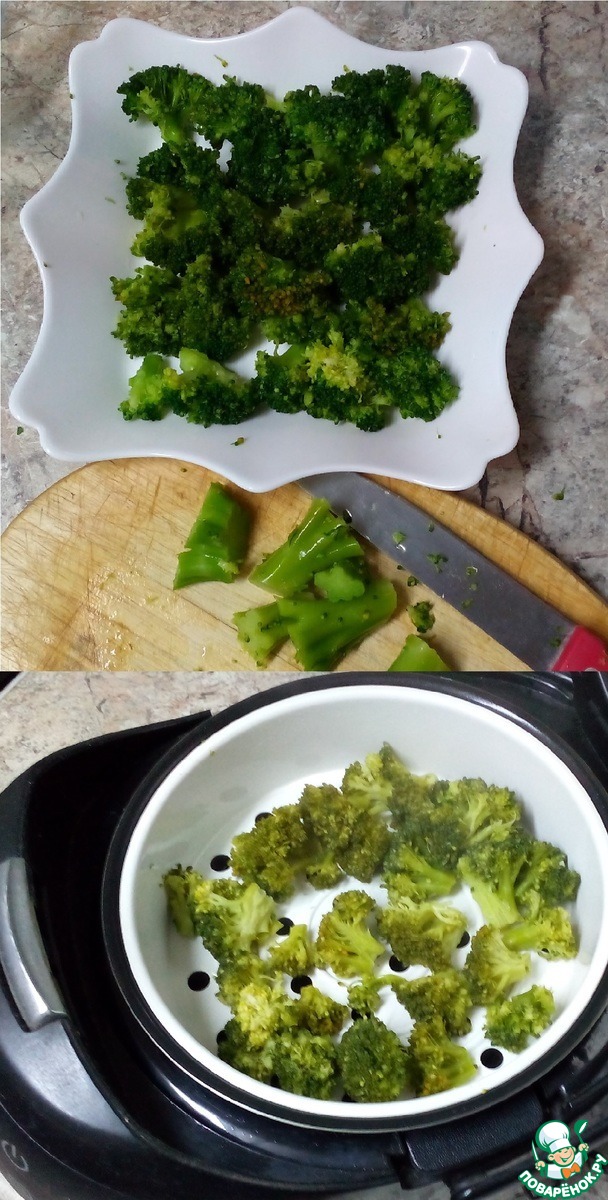 За длинный промежуток времени займитесь приготовлением начинки. Брокколи промойте, разберите на небольшие соцветия, жёсткую часть стебля удалите. Соцветия отваривайте на пару в течение 5 минут. Горбушу нарежьте небольшими кубиками, отделив шкурку и убрав все косточки.