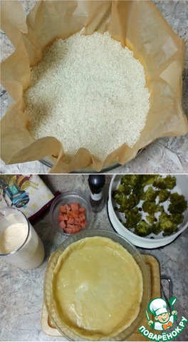 "Отдохнувшее" тесто раскатайте и выложите в смазанную форму для выпечки, сделав бортик. Выстелите тесто пергаментом, поставьте в холодильник на 30 минут, затем заполните сухим рисом, поставьте в духовку и выпекайте при 200 градусах в течение 10 минут. Из готовой основы удалите рис, пергамент снимите.