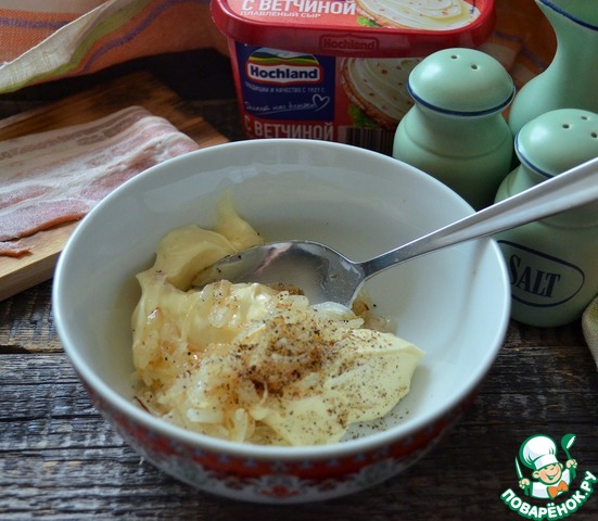 Лук почистить, мелко нарезать и обжарить на растительном масле. Смешать сыр, жареный лук. Я использую плавленый сыр с ветчиной от ТМ Hochland.