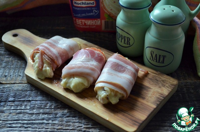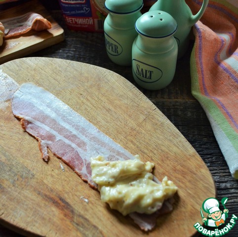 На ломтик бекона положить 1 ч. л. сырной массы.