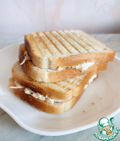Теперь - момент истины. Намазываем сырно-куриную массу на ломтик хлеба, накрываем вторым и отправляем сэндвич подрумяниться в гриль (или на сковородку), чтоб хрустел.