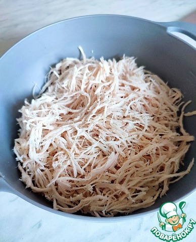 Второй этап самый кропотливый: отварное филе нужно разобрать на волокна. Честно сказать, как это сделать быстро, я не придумала. Разве что привлечь к "потрошению" филе детей, внуков или поручить стратегически важную задачу мужчине. Наверное, можно было бы мясо мелко нарезать, но тогда структура бутербродной массы изменится, а мне бы этого не хотелось