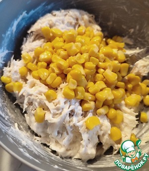 Кстати, вместо кукурузы можно взять нарезанные кубиками маринованные огурчики. Можно добавить немного специй, например, паприку. Соль я не добавляю, мне достаточно той, что есть в сыре. -