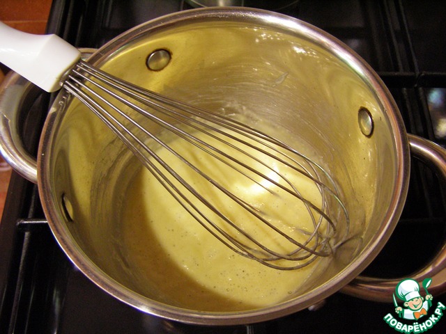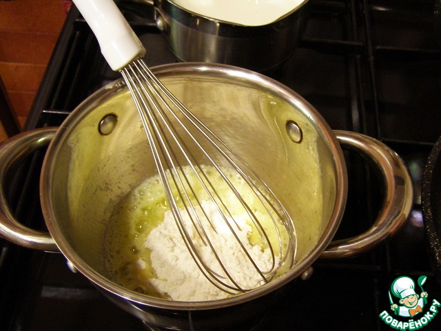 Не снимая с плиты, добавляем муку. Поджариваем на небольшом огне, постоянно помешивая венчиком (примерно 1-2 мин).