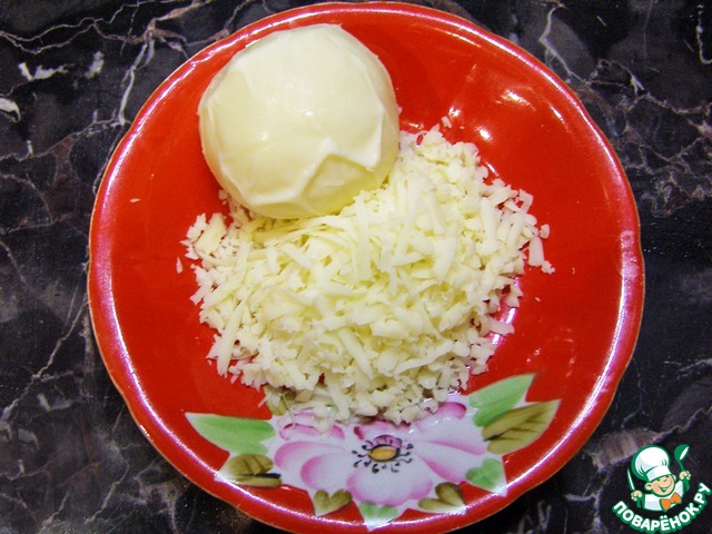 Пока остывает мука, натираем на крупной терке сыр. Лучше подойдет легкоплавкий с нейтральным вкусом, у меня сулугуни.