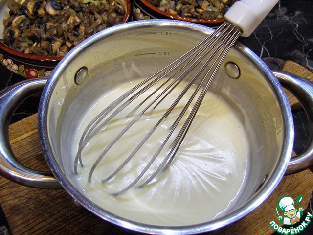 В отдельном сотейнике нагреваем молоко и постепенно вливаем в остывшую муку. Размешиваем до однородности и возвращаем на плиту. На медленном огне варим до загустения. Время варки зависит от желаемой густоты соуса: мне он был нужен для готовки, поэтому я варила до легкого загустения - 2 минуты. Снимаем с огня.