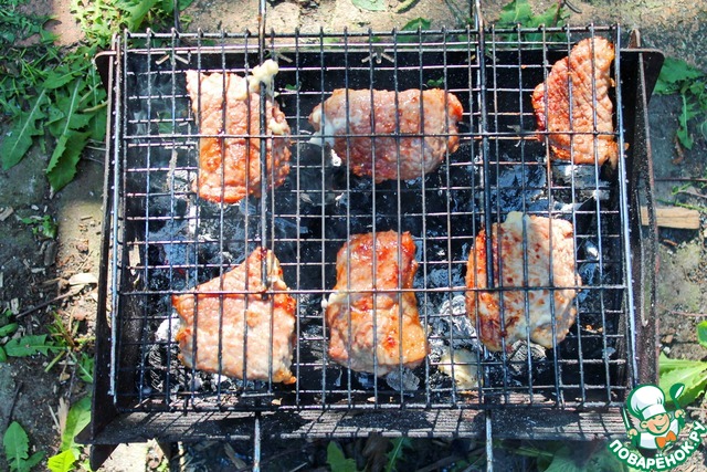 Разведите мангал и подготовьте угли. Они должны тлеть, так называемые "седые угли", которые не горят, но дают хороший жар. В решетку для мангала разложите шашлык, закройте решетку и установите над углями.