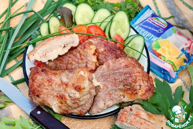 Отбитое мясо посолите, поперчите и уложите на одну половину свинины одну пластинку плавленого сыра так, чтобы края мяса были свободными. Я предпочитаю сыр фирмы "Хохланд", и по цене и качеству он меня устраивает больше всего, да и плавится он прекрасно. Положите заготовки в холодильник на 30 минут.