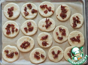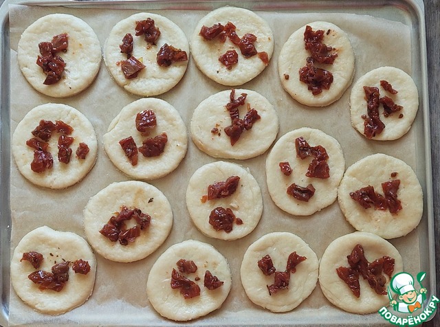 Переместить печенье на противень, застеленный пергаментной бумагой. Разложить на печенье нарезанные вяленые томаты.