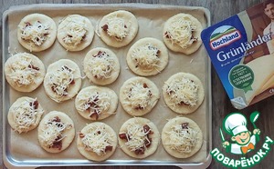 Посыпать оставшимся сыром. Готовить в духовке, заранее разогретой до 200 гр., 10-15 мин. Затем вынуть противень из духовки и дать печенькам остыть.