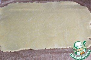 Намочить пергамент, отжать его, на нем раскатать тесто через пленку.
