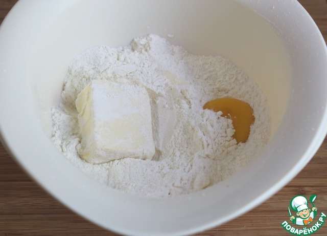 В чашу выложить сливочное масло, сахар, муку с разрыхлителем, влить яйцо и всыпать щепотку соли.