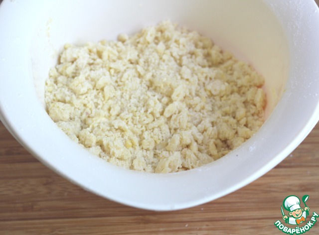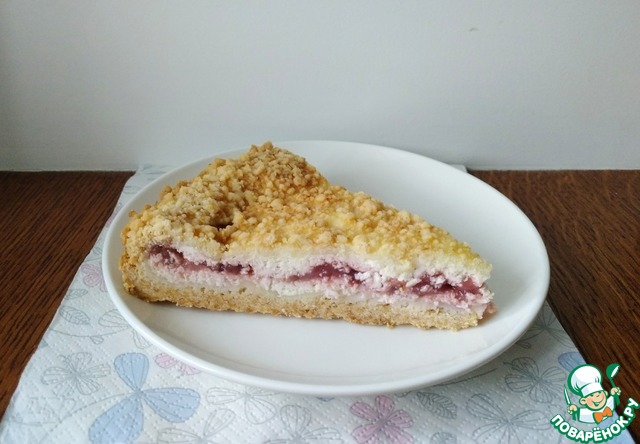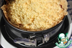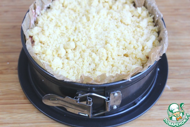 Сверху выложить оставшуюся крошку. У меня форма диаметром 18 см.