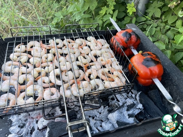 На природе разожгите в мангале угли - они должны прогореть и подернуться белым пеплом. Готовьте креветки на решетки, 3 минуты с каждой стороны. Перцы наколите на шампур и обожгите со всех сторон до черноты.